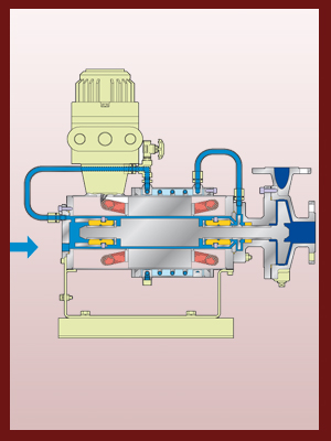 The basic construction is identical with that of the High-Temperature Type. The function of this arrangement is to prevent the slurry handled from entering into the rotor chamber. Clean compatible liquid with the liquid handled is flushed from the inlet port established at the rear of the motor to prevent slurry from entering into the rotor chamber, for which back flushing line would have to be established. for the amount of liquid used for back flushing.